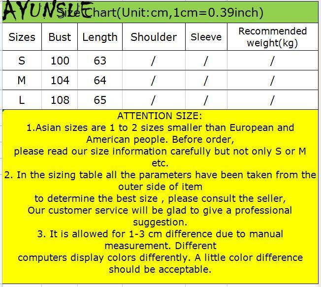 | ATTENTION SIZE: 1.Asian sizes are 1 to 2 sizes smaller than European and American people. Before order, please read our size information carefully but not only S or M etc. 2. In the sizing table all the parameters have been taken from the outer side of item to determine the best size , please consult the seller, Our customer service will be glad to give a professional suggestion. 3. It is allowed for 1-3 cm difference due to manual measurement. Different computers display colors differently. A little color difference should be acceptable. |